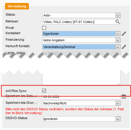 Damit eine Adresse synchronisiert wird muss der Haken onOffice-Sync (durch Sie persönlich) in der Adresse gesetzt werden.