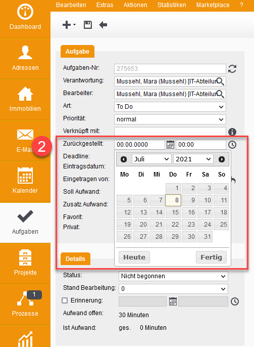 Wählen Sie ein Datum und eventuell eine Uhrzeit aus, bis wann die Aufgabe zurückgestellt werden soll und speichern Sie abschließend.