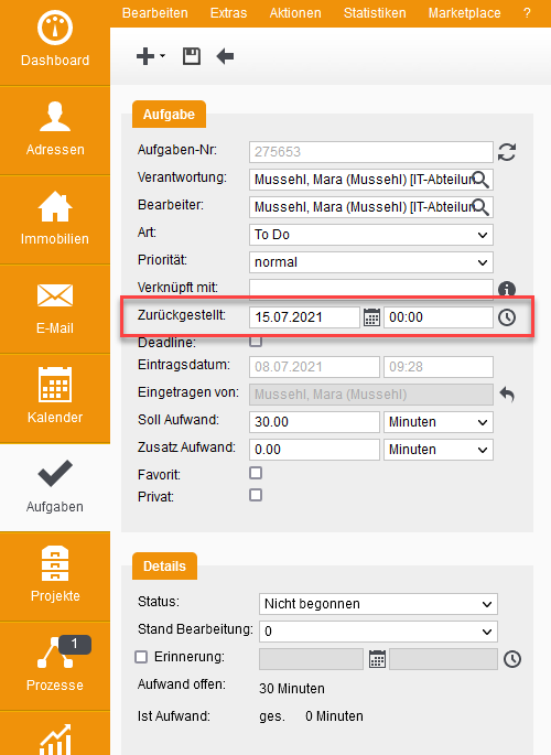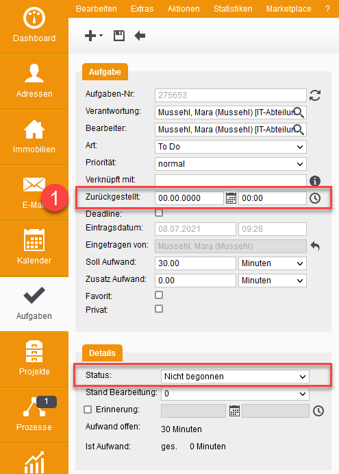 Wenn Sie eine Aufgabe zurückstellen möchten, tun Sie dies bitte über das Feld "Zurückgestellt".