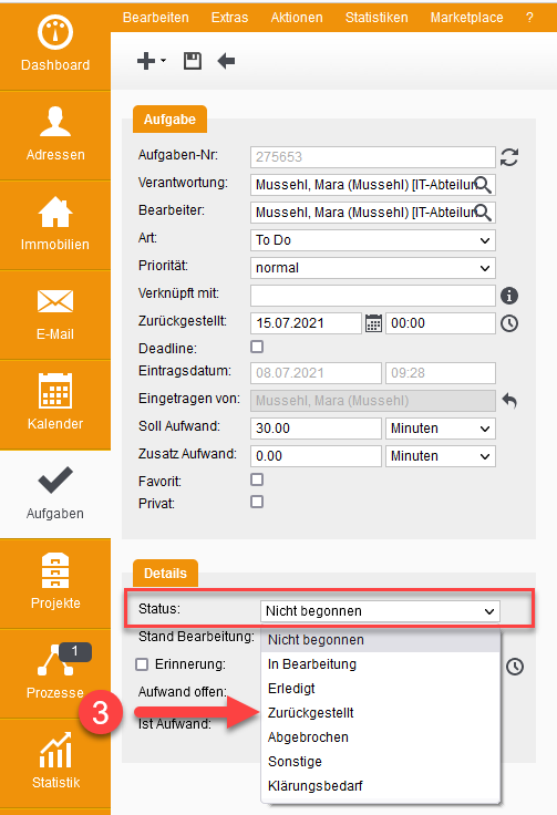 Bitte stellen Sie Aufgaben nicht einfach zurück, indem Sie den nur Status in "Zurückgestellt" verändern. Dadurch verschwindet die Aufgabe und wird auch nicht mehr in ihrer Aufgabenliste aufploppen. ![]()