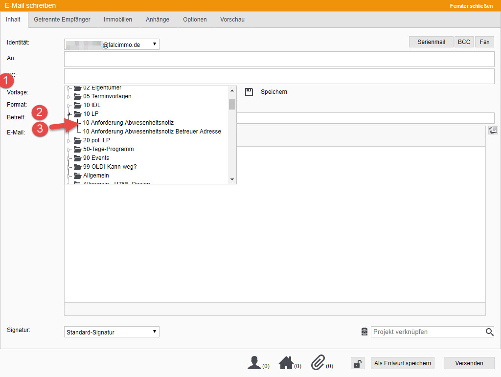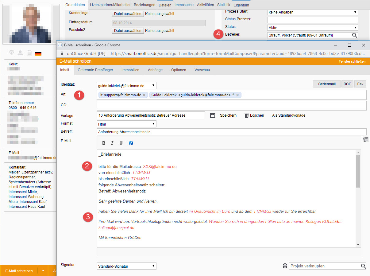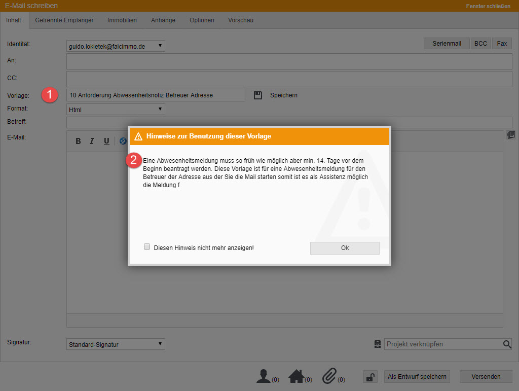 Dann benutzen Sie die Vorlage "10 Anforderung Abwesenheitsnotiz Betreuer Adresse" (siehe ) es erfolgt ein entsprechender Hinweis (siehe