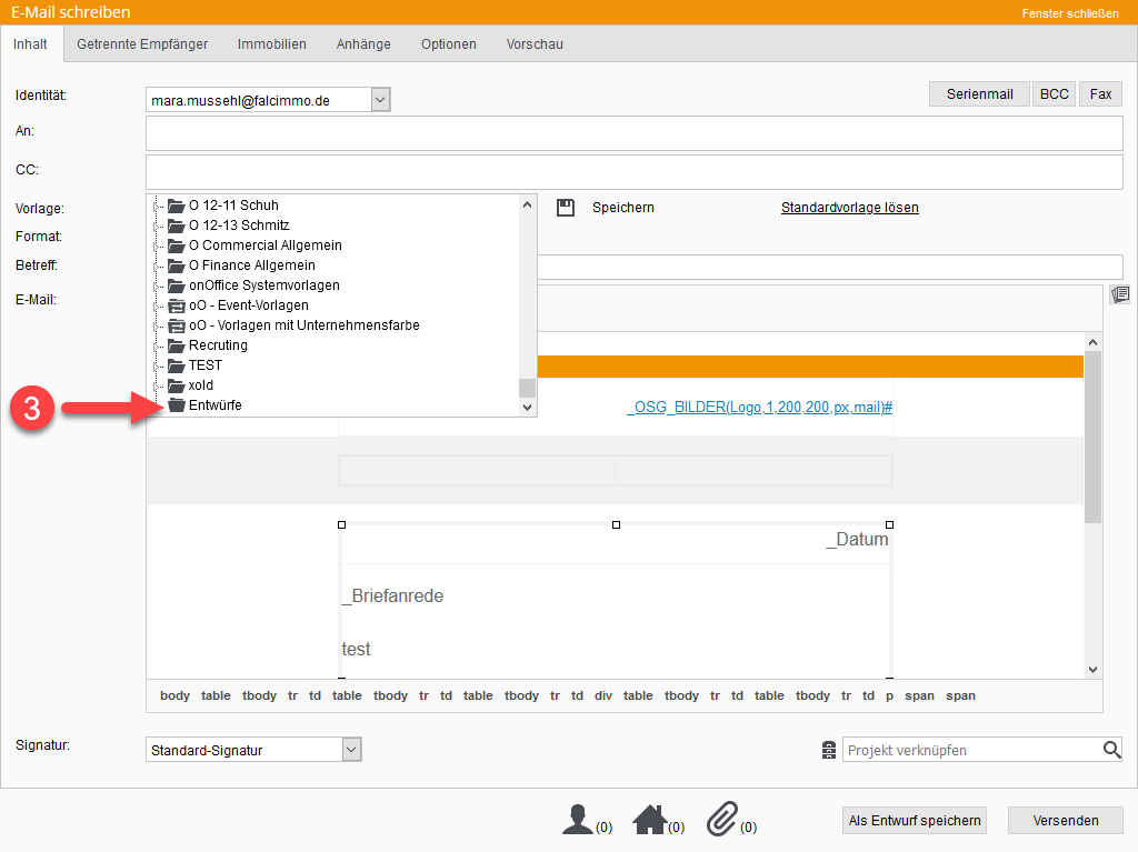 Entwürfe finden Sie in dem Dropdown für die Vorlagen. Am Ende im Ordner Entwürfe.