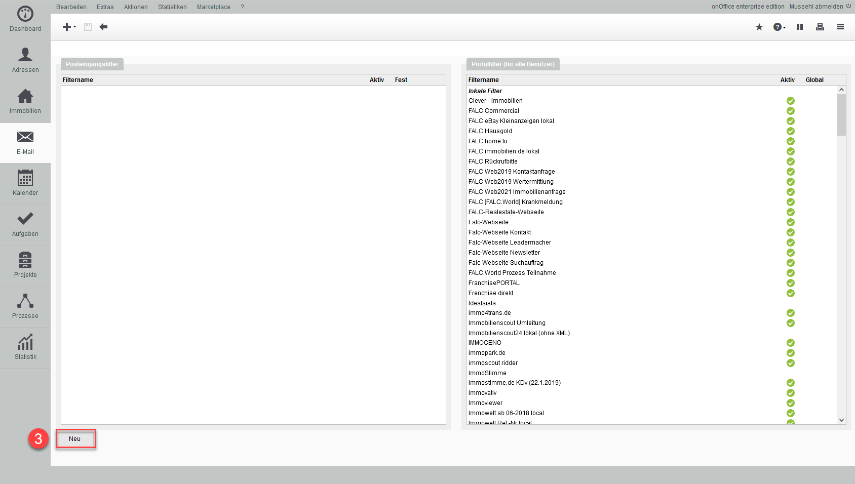 Klicken Sie unten auf Neu, um einen neuen Email-Filter anzulegen.