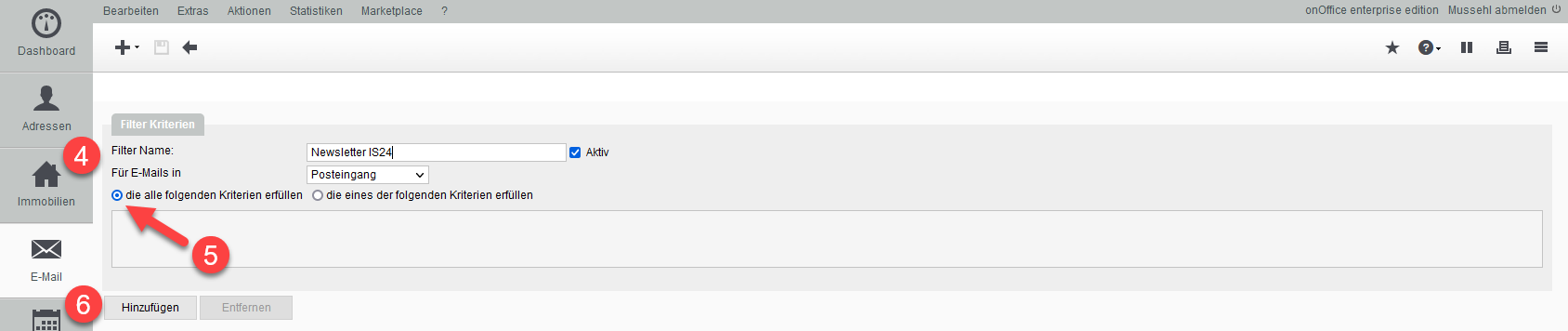 Wählen Sie aus, dass die Emails alle der folgenden Kriterien erfüllen müssen.