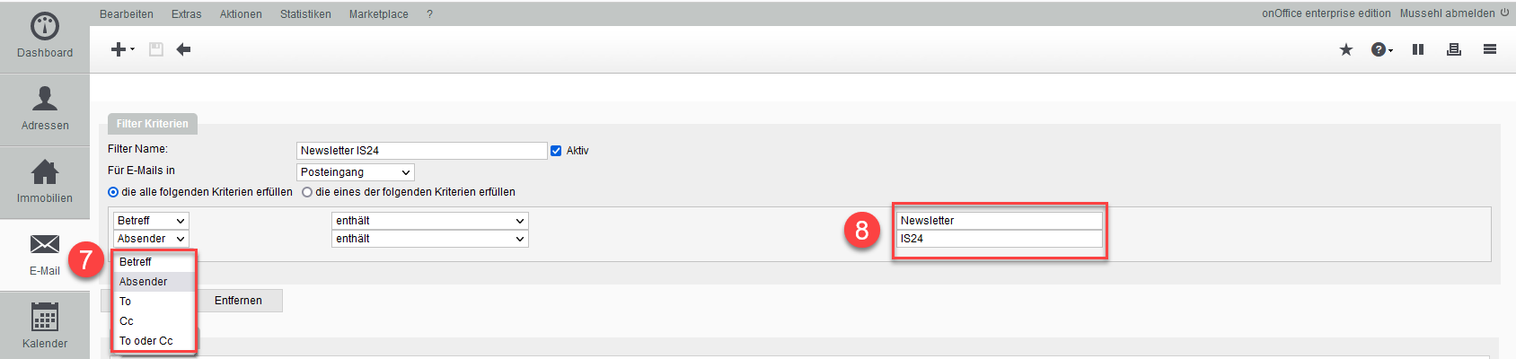In diesem Feld können Sie das Kriterium (Absender, Betreff etc.) spezifizieren
