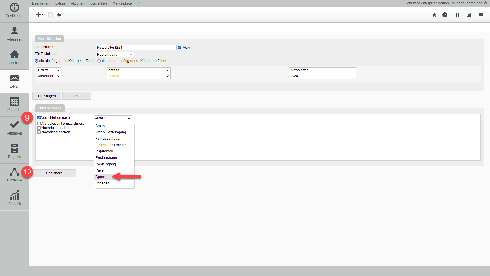 Abschließend setzen Sie den Haken bei Verschieben nach und wählen den Ordner aus, in den die Email verschoben werden soll. In diesem Fall wäre das der Ordner Spam.