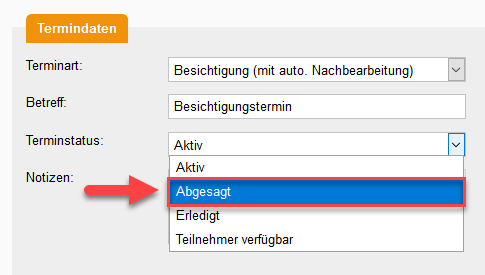 Wenn bei Ihnen der Fall auftreten sollte, dass Sie eigentlich (sowohl bestätigte als auch nicht bestätigte) Besichtigungsstermine für eine Immobilie hätten, diese aber nun reserviert ist, dann stellen Sie den Termin auf abgesagt.