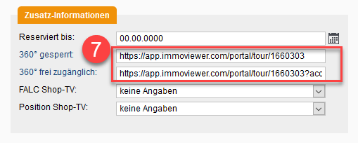 Zum Schluss müssen Sie nur noch einmal unter Vermarktung die FALC Homepage aktualisieren und den Link https://app.immoviewer.com/portal/tour/Objektnummer unter "360° gesperrt" und "360° frei zugänglich" wie unter