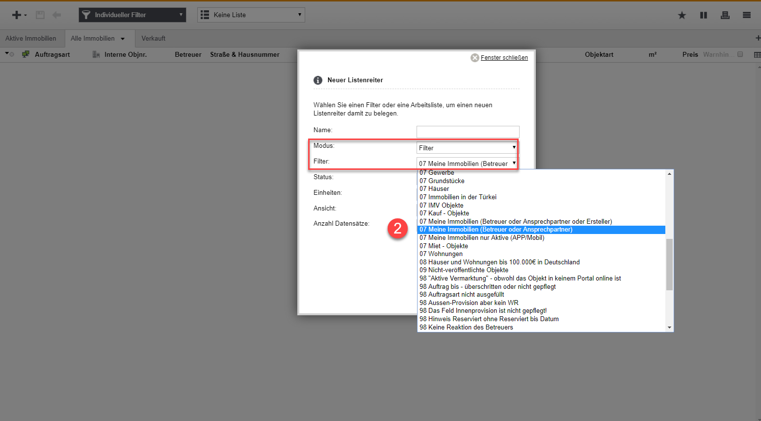 Dort wählen Sie den Modus "Filter" aus und unter Filter nehmen Sie bitte immer "07 Meine Immobilien (Betreuer und Ansprechpartner)" (siehe