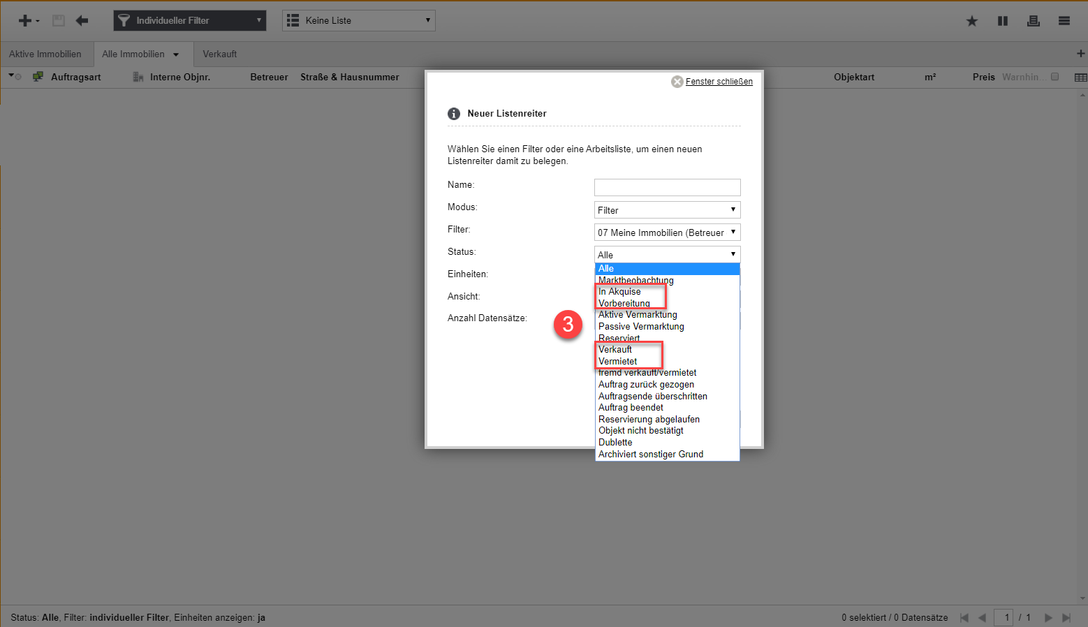 Außerdem empfehlen wir Ihnen einen der 4 Stati "in Akquise, Vorbereitung, vermietet oder verkauft" auszuwählen (siehe
