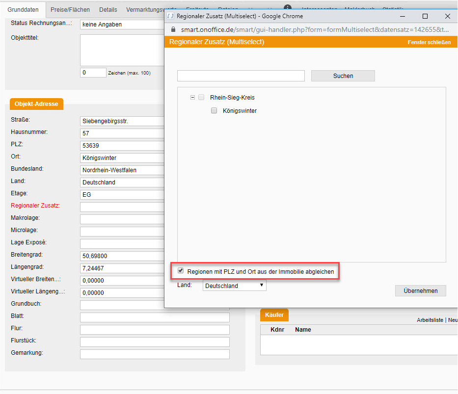 Damit Ihnen bei der regionalen Zuordnung die passende Region angezeigt wird, müssen Sie auf das Kästchen "Regionen mit PLZ und Ort aus der Immobilie abgleichen" unten im Pop-up klicken.