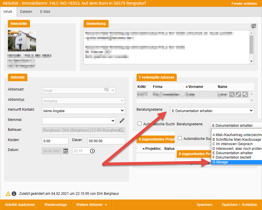 Stellen Sie dann die Beratungsebene auf G - Absage und speichern Sie abschließend.