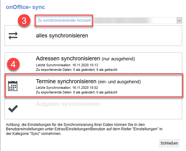 Wählen Sie ihren Namen in dem Feld für den zu synchronisierenden Acount aus, falls Sie mehrere zur Auswahl haben.