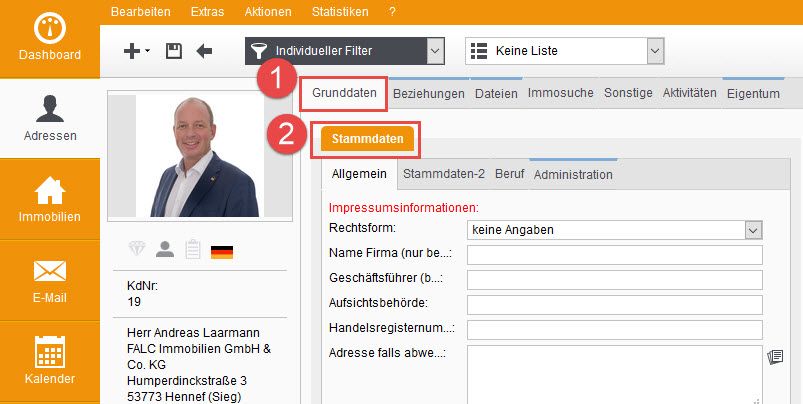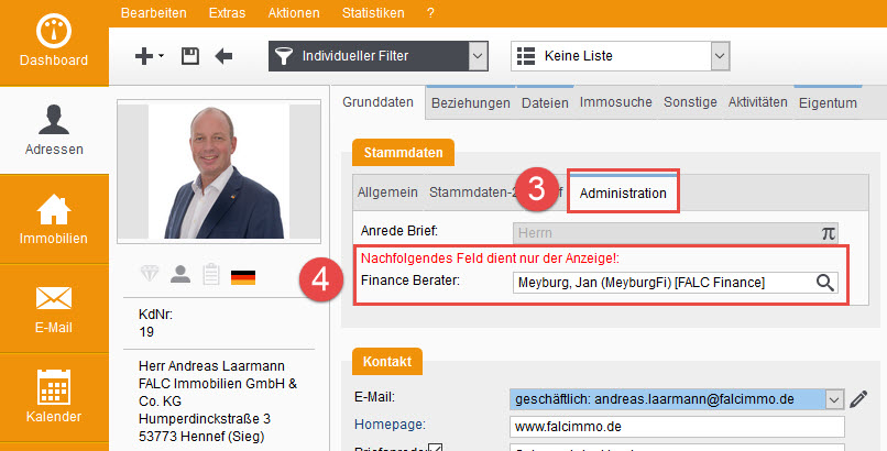 Zu finden ist ihr Financeberater auf dem Reiter Grunddaten in der eigenen Adresse.