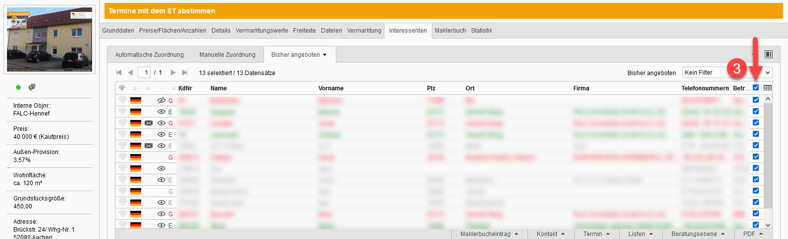 Wählen Sie indem Sie oben das Kreuz setzen alle Interessenten aus. Ansonsten können Sie auch manuell die Interessenten auswählen.