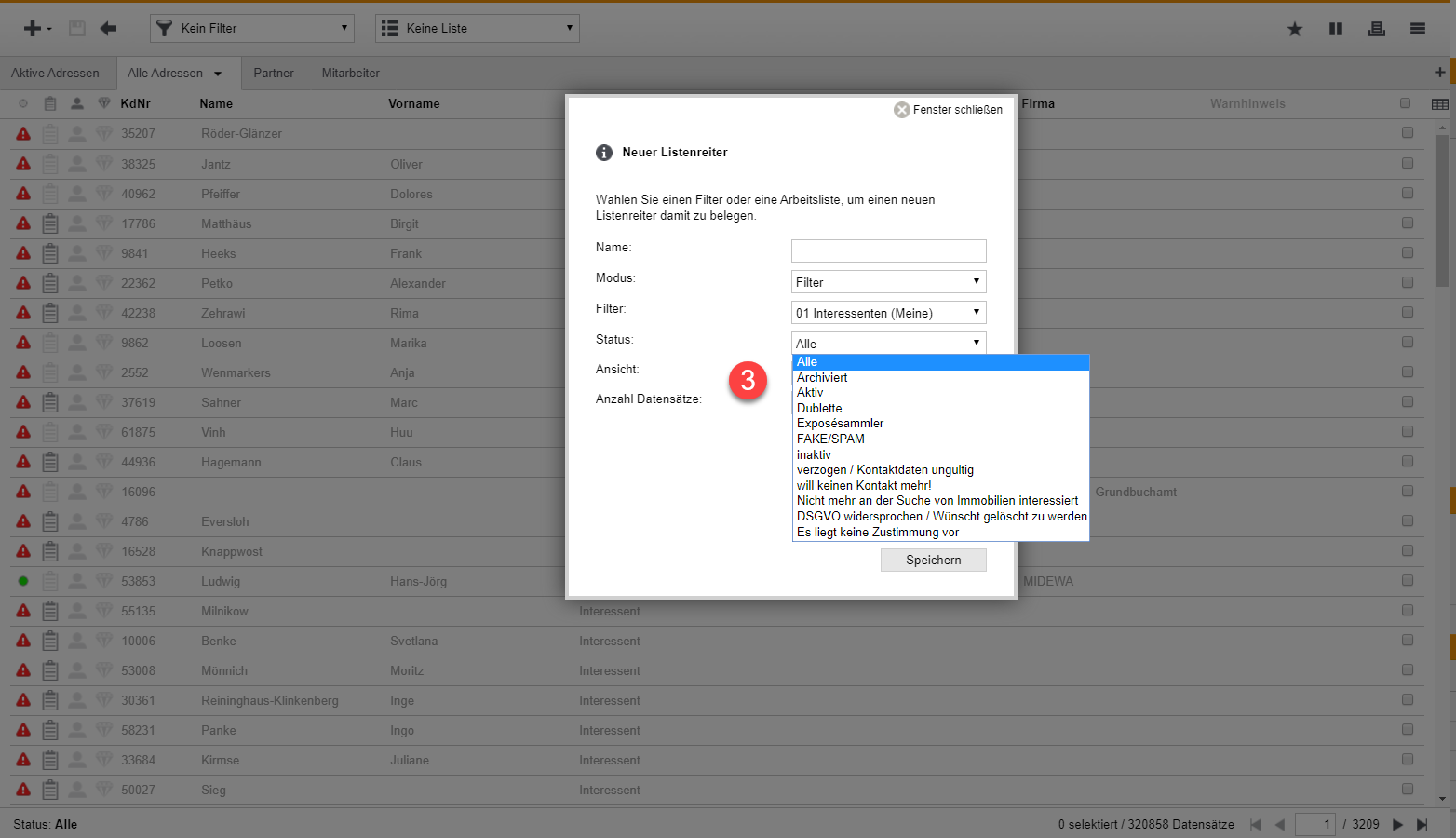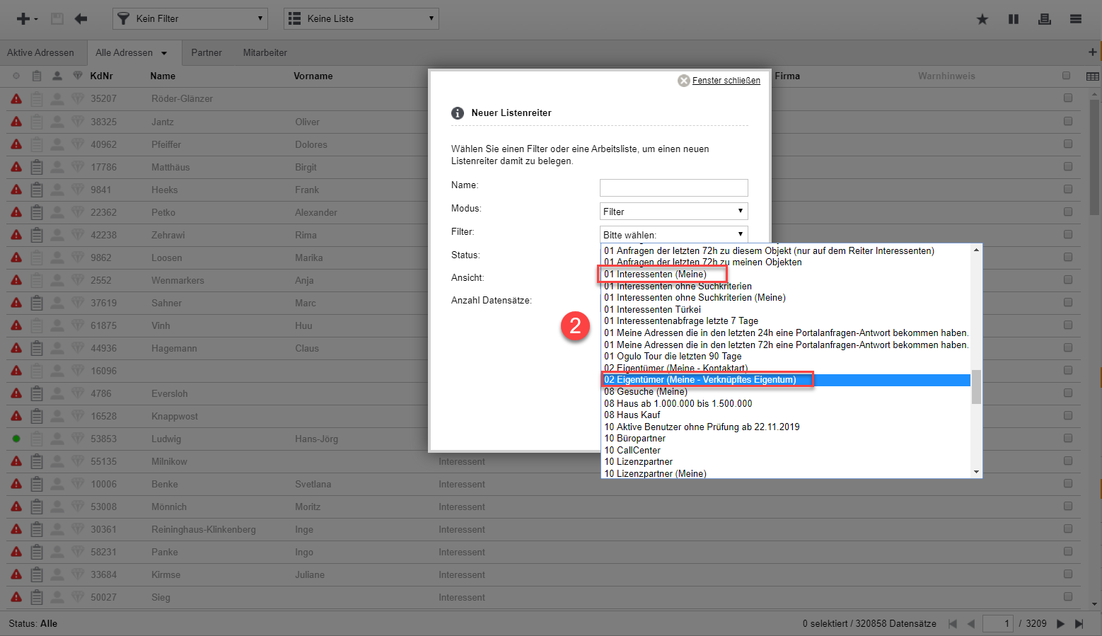 Dort wählen Sie den Modus "Filter" aus und unter Filter können sich für "02 Eigentümer (Meine-Verknüpftes Eigentum)", "01 Interessenten (Meine)" etc. entscheiden (siehe