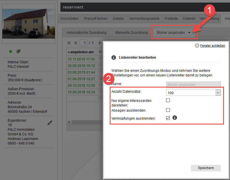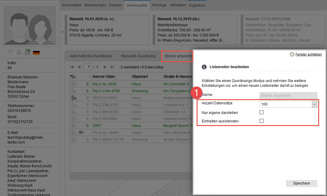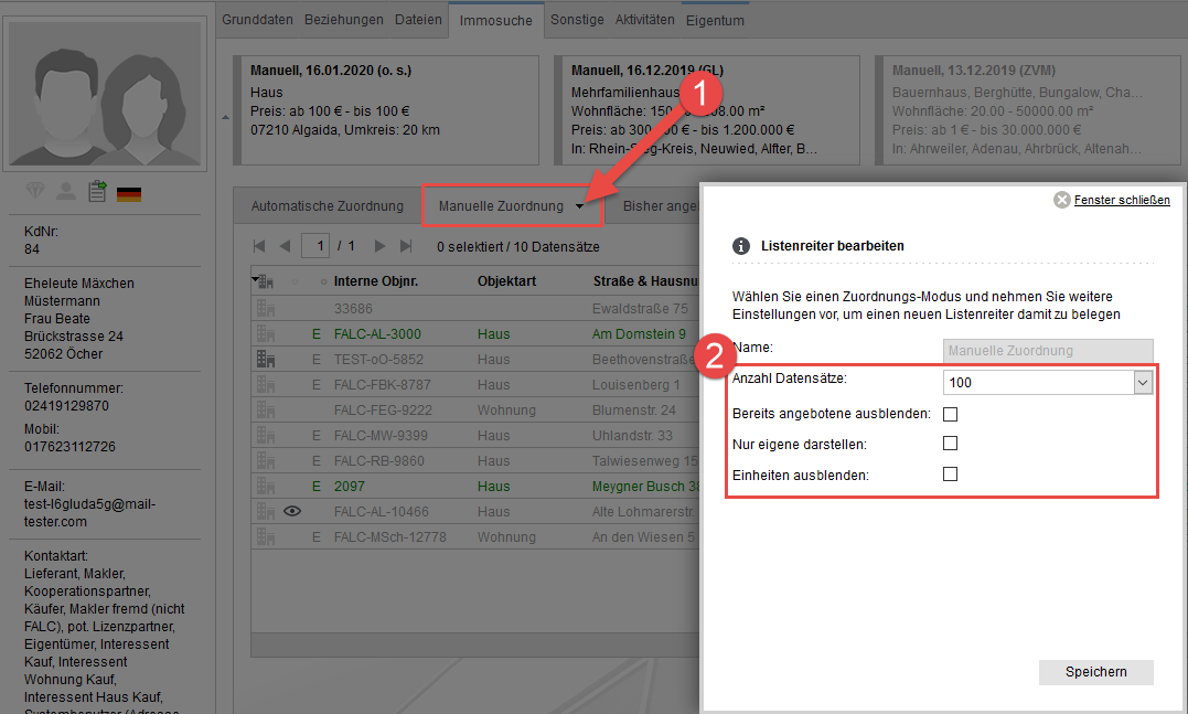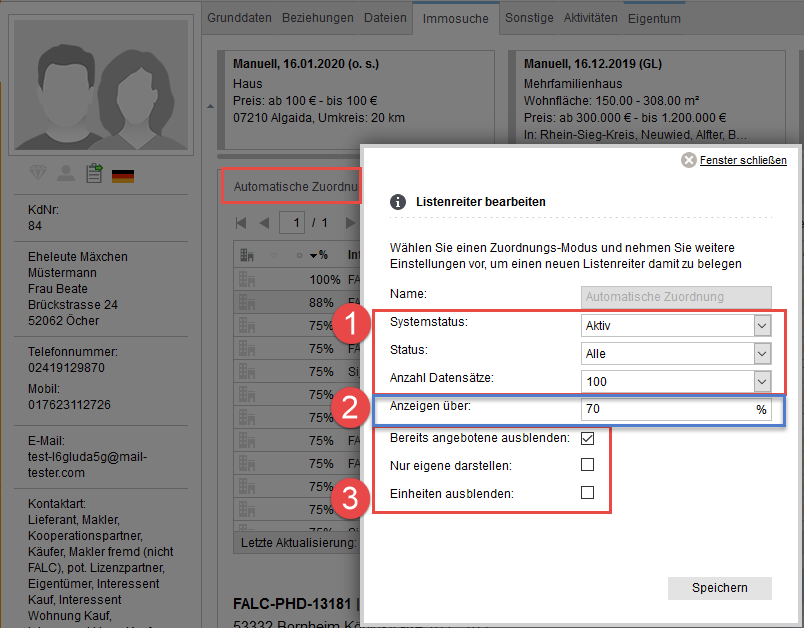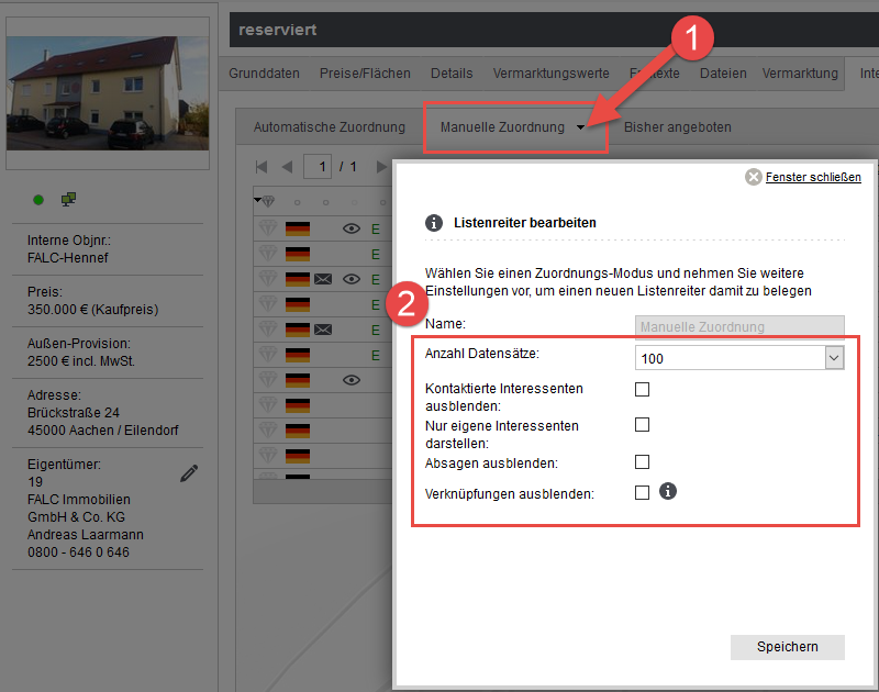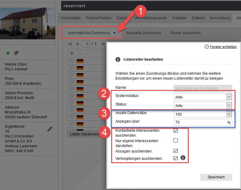 [Adressen, Immobilien, Reiter] Wie stelle ich die Reiter für Automatische Zuordnung, Manuelle Zuordnung und bisher angeboten richtig ein?