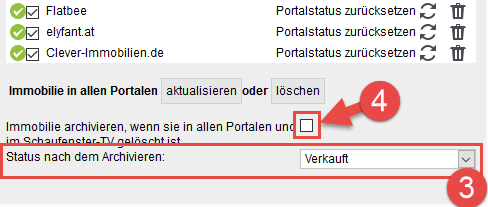 Nun stellen Sie den Status unterhalb der Liste der Portale auf den gewünschten Status (in der Regel Vermietet/Verkauft) für die Archivierung unter